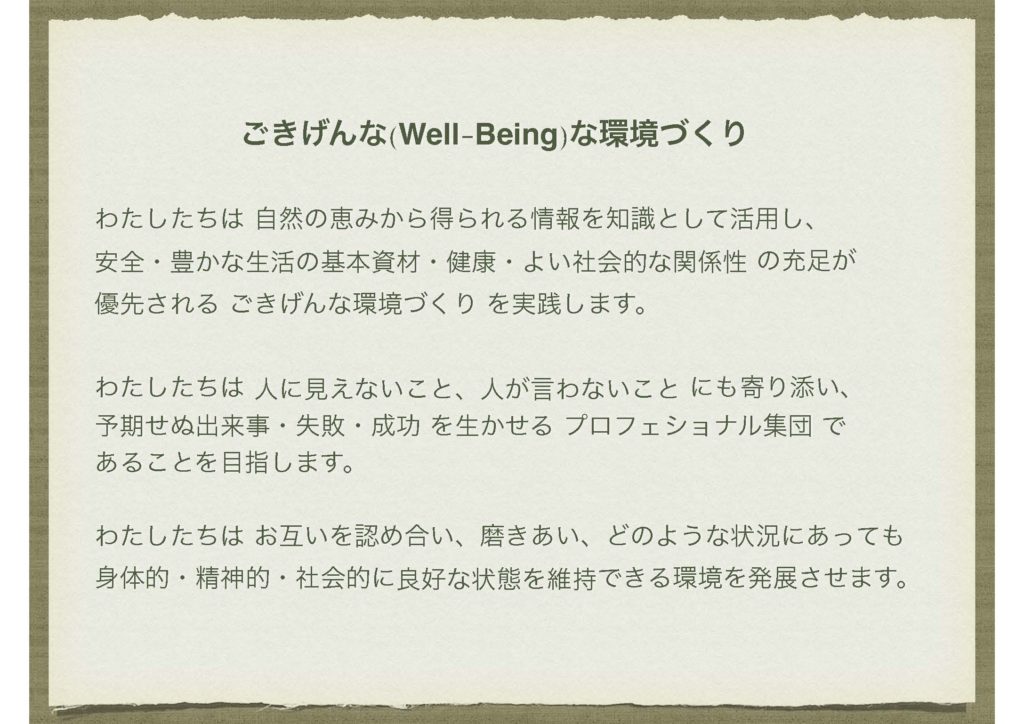 個人の権利や自己実現が保障され、人間が身体的、精神的および社会的に良好な状態で暮らせる持続可能な地球環境を導く企業としてありたい。生態系サービスを豊かにする事業、ひいては、P・F ドラッカー氏の唱える社会生態系サービスをも豊かにする事業に取り組み、地域のみなさまがついつい微笑んでしまう ごきげんな環境づくり に励んでまいります。